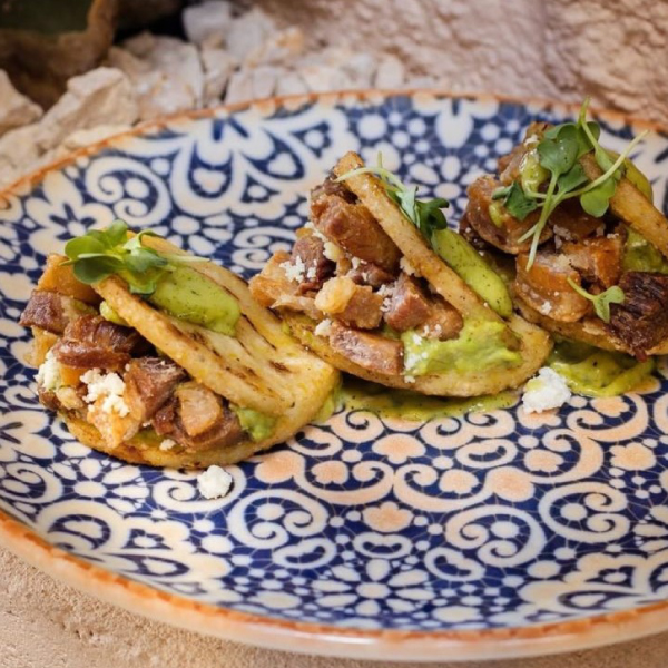 Arepitas rellenas de guacamole. Chicharrón y queso fresco, acompañadas de un alioli suave de queso crema. Irresistible en cada bocado.